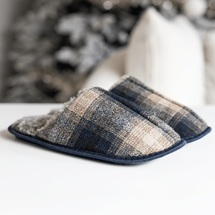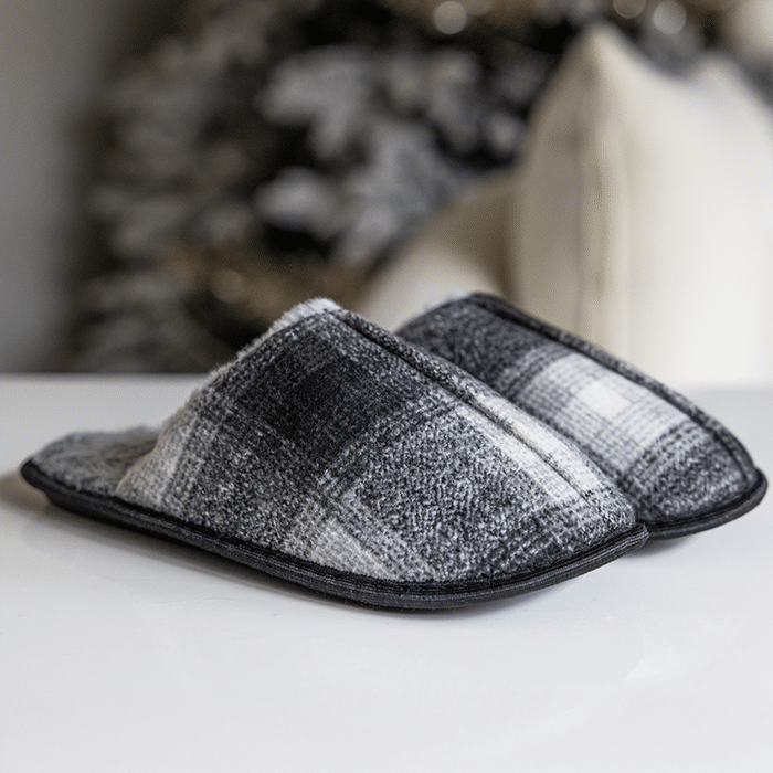 • Mjuka, fodrade tofflor (storlekar 41–45), färger: grå och brun