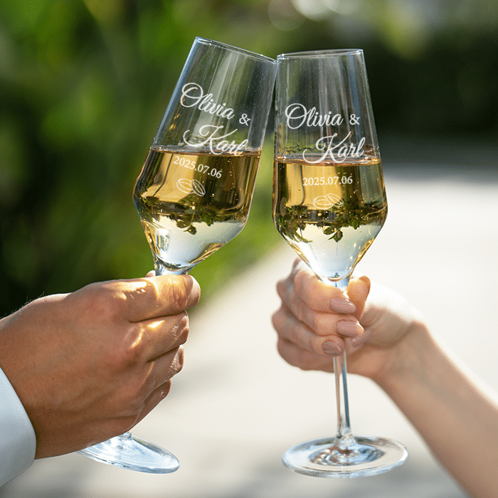 Champagneglas med namn och datum ingraverade är garanterat en personlig och uppskattad gåva till brudparet, förlovningsparet eller varför inte som morgongåva eller som årsdagspresent till din partner. Tunna, högkvalitativa glas och den höga foten ger en lyxig och festlig känsla. Kanske passar en flaska bubbel till?