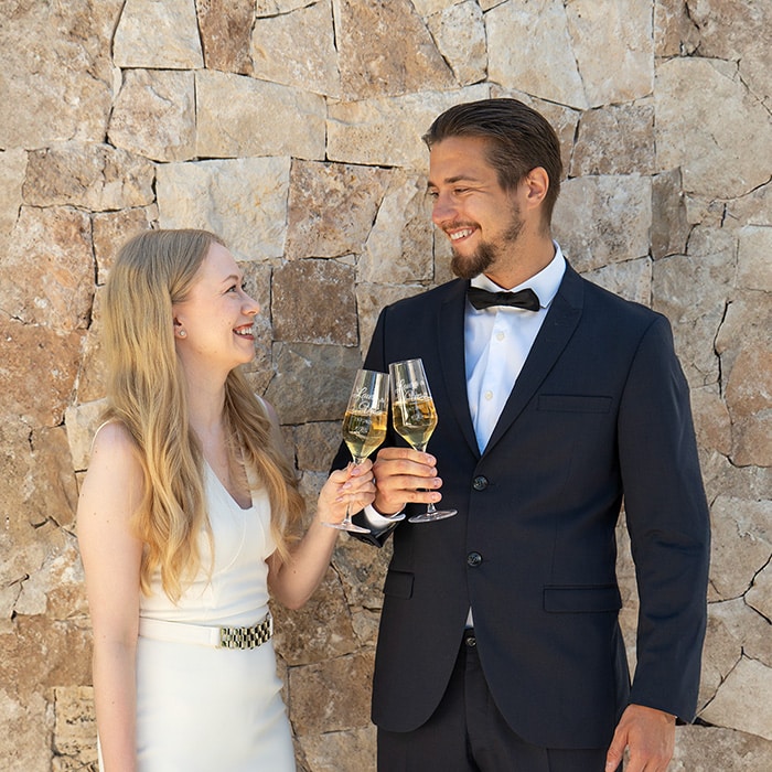 Champagneglas med egna namn är en fin idé till bröllop, förlovning eller jubileum.