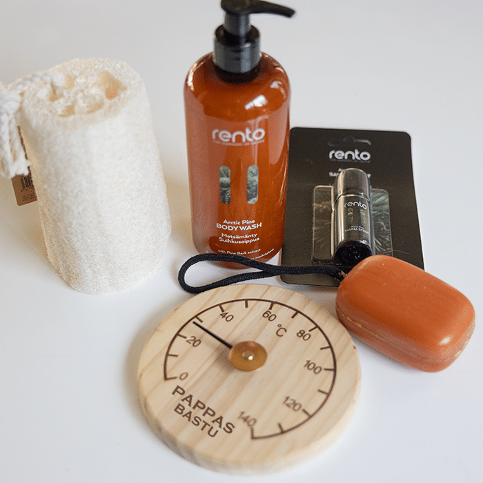 Setet innehåller dessutom högkvalitativa finska Rento-bastuprodukter samt en vacker bastutermometer i trä med personlig gravyr.