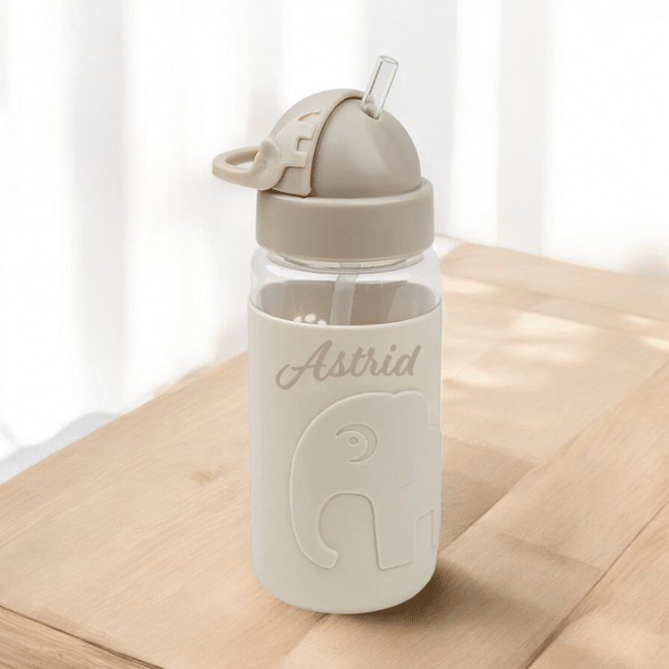Flaskan har ett lock med inbyggt sugrör som fälls in, vilket förhindrar läckage när flaskan inte används. Det praktiska bärhandtaget hjälper små händer att hålla i sugröret. Det söta silikonöverdraget med elefantmönster förbättrar greppet och ger en lekfull detalj.