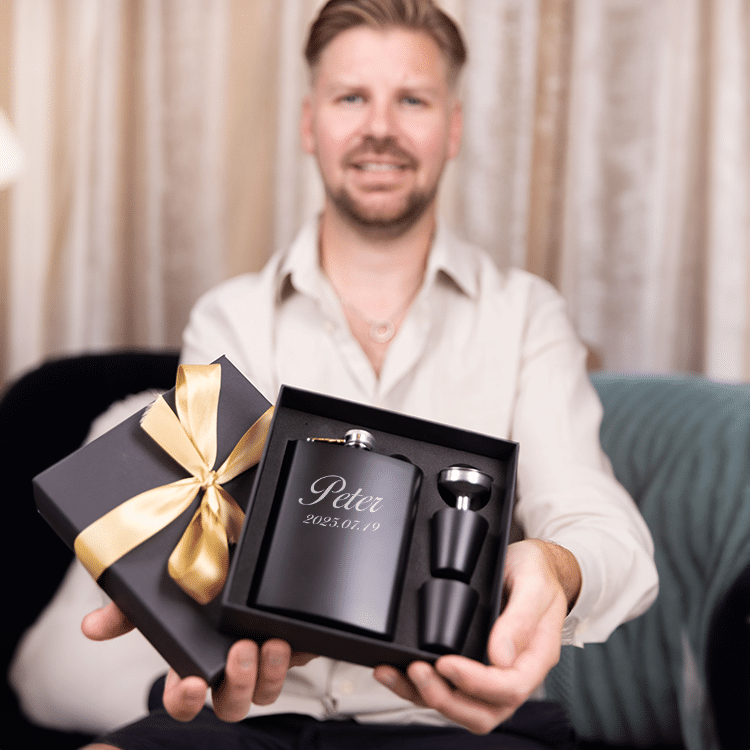 En fickplunta med gravyr är en riktigt rolig presentidé. Setet innehåller inte bara en fickplunta, utan också två stiliga snapsglas och en tratt som gör det enkelt att fylla pluntan.