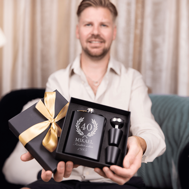 En fickplunta med gravyr är en riktigt rolig present till en man. Setet innehåller inte bara en fickplunta, utan också två stiliga snapsglas och en tratt som gör det enkelt att fylla pluntan.