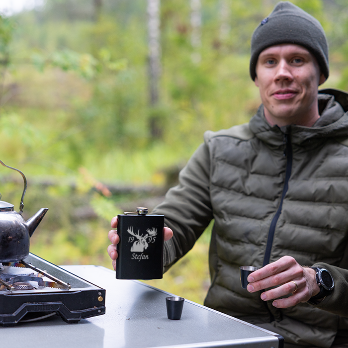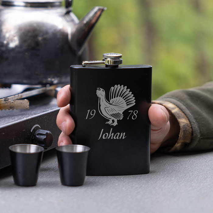 Ta med dig en varm stund på jaktresan, vandringen eller festtillfället – denna fickplunta är den perfekta följeslagaren för jägaren. Gravyren kombinerar ett årtal högst upp, ett valfritt viltmotiv i mitten (älg, and, tjäder osv.) och ett namn eller annan text längst ner. På så sätt blir varje fickplunta en unik och värdefull gåva.