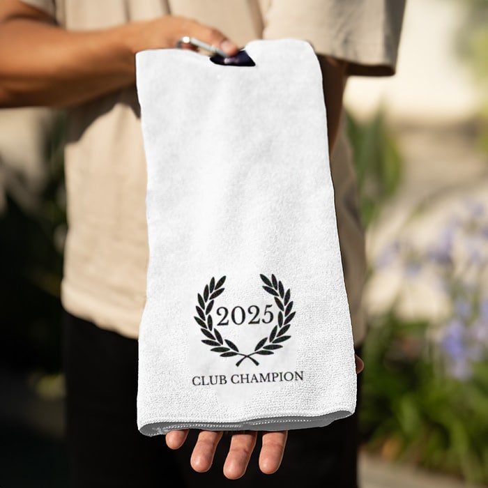Funderar du på present till golfaren? Denna broderade golfhandduk är garanterat en elegant detalj i varje golfväska! Du kan själv bestämma vilka initialer som broderas, så det här är en perfekt present till maken, pappa eller pojkvännen. Denna golfhandduk duger verkligen till att ta med på golfbanan.