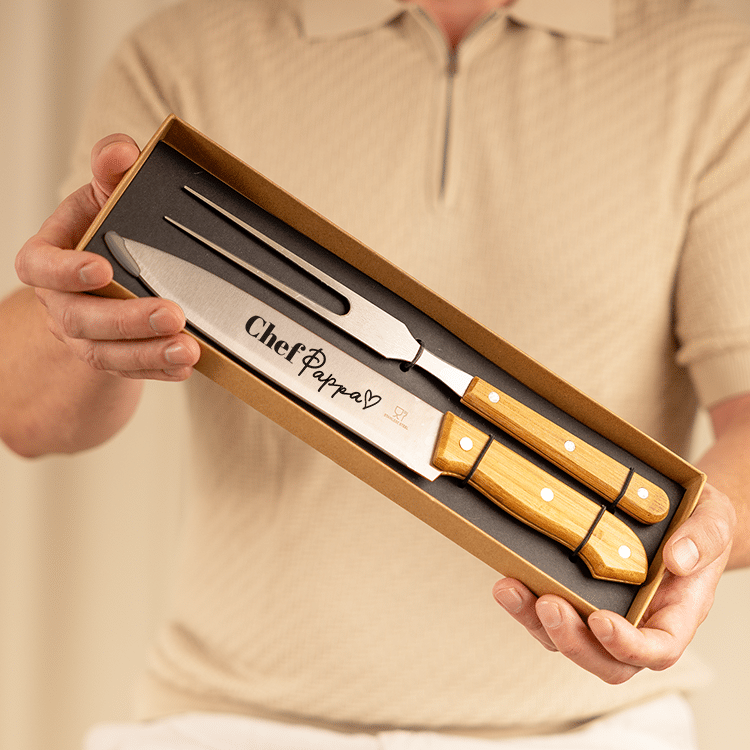Detta drömset är en perfekt present för den som tycker om matlagning. Setet innehåller en imponerande kniv och stekgaffel tillverkade i rostfritt stål och trä.