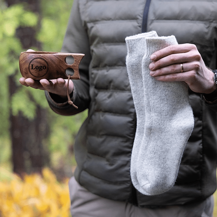 Kåsa och stilrena merinoullsockor är den perfekta julgåvan till personal eller samarbetspartners. På kåsan kan man gravera en logotyp eller varje persons namn. Merinoullsockorna är varma, ventilerande och torkar snabbt. Merinoull är ett material för alla väder och en garanterat uppskattad julklapp. Välj herrstorlek (one size 41–45) eller damstorlek (37–41).