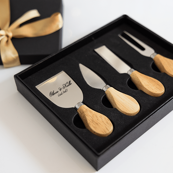 Ostknivar med gravyr är ett perfekt gåva för ostälskaren och även en trevlig gå-bort-present! Knivarna är stilfulla och den graverade texten ger en personlig och fin touch till dukningen. Setet innehåller 4 olika ostknivar som passar för både mjuka och hårda ostar samt en ostgaffel. Graveringen görs på den största kniven, som på bilden.