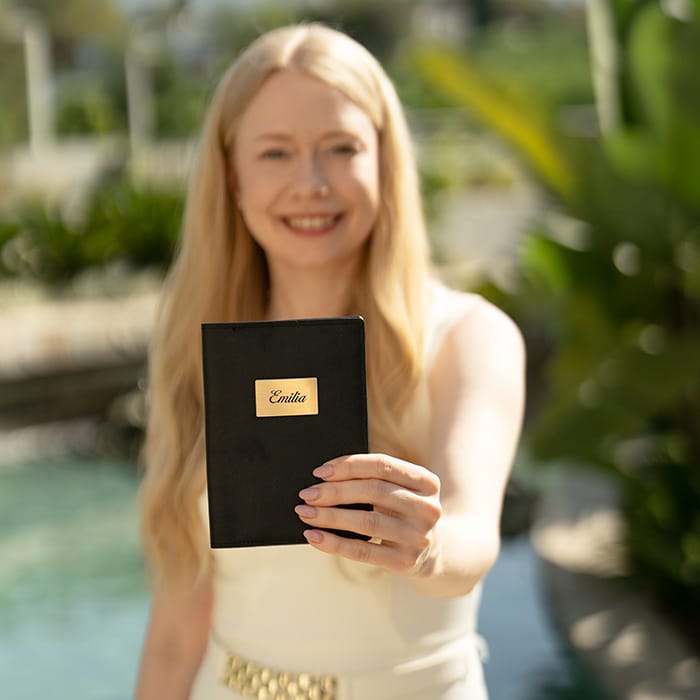 Ett passfodral med namn är den perfekta presenten till en partner, förälder eller vän som älskar att resa. Det är också ett roligt sätt att överraska någon i samband med en resa. Det svarta fodralet med en guldfärgad namnskylt är en elegant helhet – ett tillbehör man stolt bär med sig på resan och gärna visar upp på flygplatsen innan avgång.