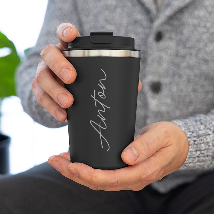 Egna, personligt graverade termosmuggar är både en fin och praktisk presentidé för till exempel ett par. Tack vare termosmuggens dubbla väggar håller den drycken varm eller kall under lång tid.