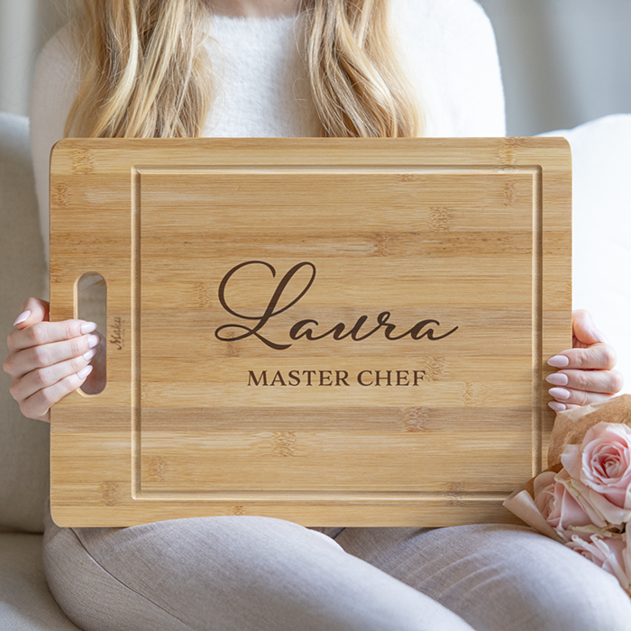 Den eleganta skärbrädan med gravyr är en rolig present! Skärbrädan är en personlig detalj i dukningen och passar garanterat i varje hem. Du kan använda de färdiga textidéerna i produktbilderna eller hitta på en helt egen text och bestämma själv med vilka ord du glädjer mottagaren.