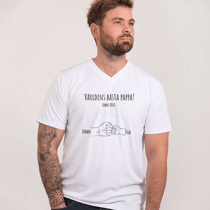 Designa en unik och praktisk present till pappa genom att trycka en stilfull text på en T-shirt. Den högkvalitativa herr T-shirten med V-ringning är lätt, andas bra och är särskilt utformad för tryck, vilket ger en tydlig och hållbar bild.