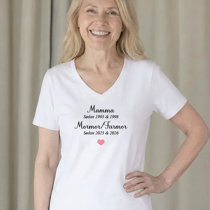 Designa en unik och praktisk morsdagspresent till mamma eller mormor/farmor genom att trycka en tröja med din egen stilrena text. Den högkvalitativa T-shirten för kvinnor är lätt, andas väl och är särskilt utformad för tryck, vilket ger ett klart och hållbart resultat.