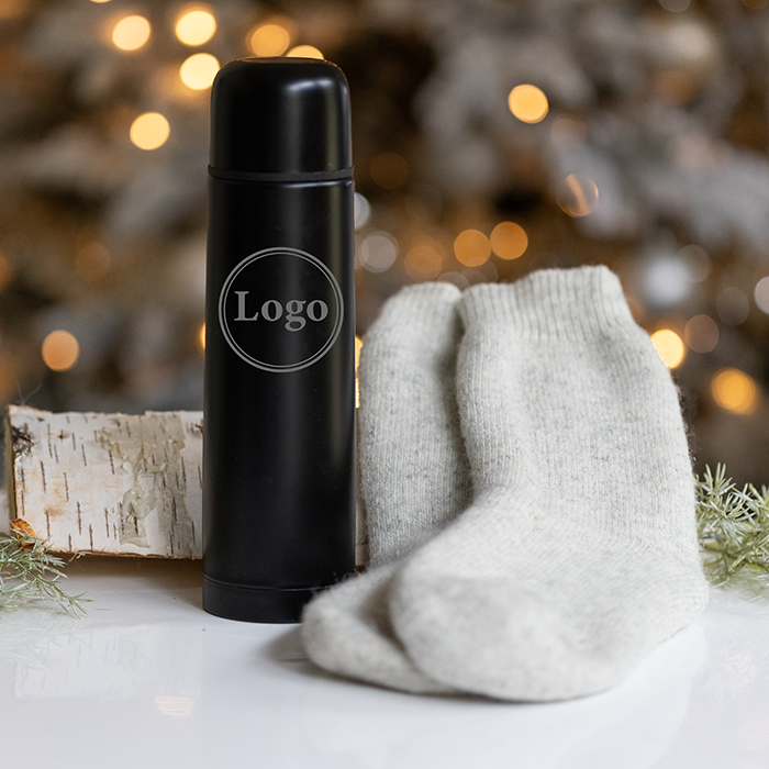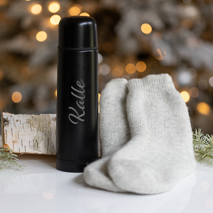 Termosflaska med gravyr och merinoullstrumpor – set