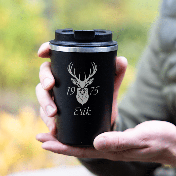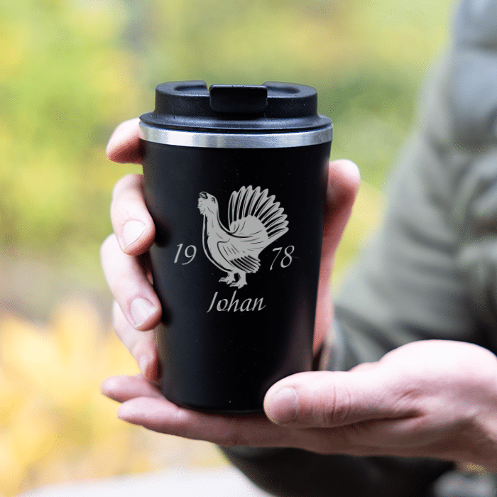 Med denna termosmugg håller du kaffet varmt både på passet och vandringen. En termosmugg med egen gravyr är garanterat en pålitlig produkt för varje jägare och friluftsmänniska. Graveringen gör den personlig. Du kan lägga till ett årtal högst upp, ett viltmotiv (älg, tjäder, hare osv.) i mitten och längst ner ett namn eller annan text.