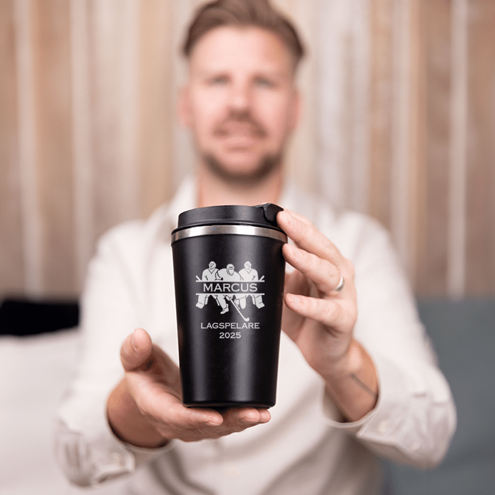 Med denna termosmugg håller du kaffet varmt, även när matchen går till förlängning. En termosmugg med personlig gravyr blir garanterat en favorit för alla som spelar eller hejar på ishockey. Gravyren gör den verkligen unik. Du kan till exempel gravera in ett namn och en personlig text.