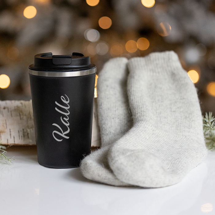 Termosmugg med gravyr och merinoullstrumpor – gåvoset