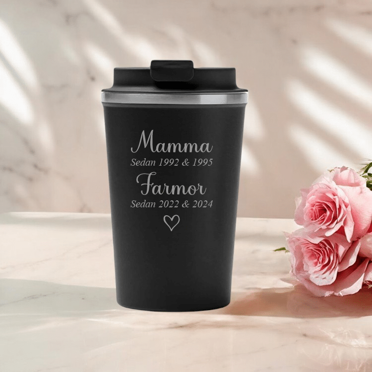 En stilren termosmugg med egen text är en fantastisk presentidé – perfekt till mamma, farmor eller mormor! Skriv bara in den text du önskar så är produkten färdig för beställning. Dessutom är den både praktisk och stilren. Termosmuggen är tillverkad av högkvalitativt rostfritt stål, vilket garanterar en bra användarupplevelse och en lång hållbarhet.