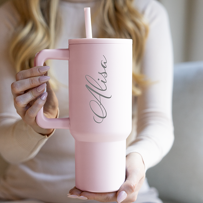 Tumbler-termosmuggen klarar även de mest fartfyllda dagarna. Den rymliga tumblern på 90 cl kan förses med din egen personliga gravyrtext. Det medföljande locket och det praktiska sugröret gör den enkel att använda var som helst – på jobbet, i naturen eller under träningspasset. Oavsett om det gäller varmt kaffe, uppfriskande iste eller något däremellan håller dubbelväggen drycken i perfekt temperatur länge – varm under kalla dagar och sval i sommarhettan.