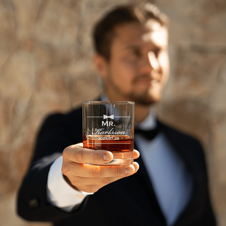 Vad vore en bättre morgongåva till brudgummen än ett whiskyglas med en personlig gravyr – kanske tillsammans med en flaska av hans favoritwhisky?