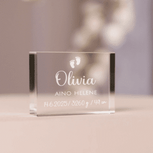 På denna vackra glasdekoration kan barnets födelsedatum eller en kort dikt graveras.
